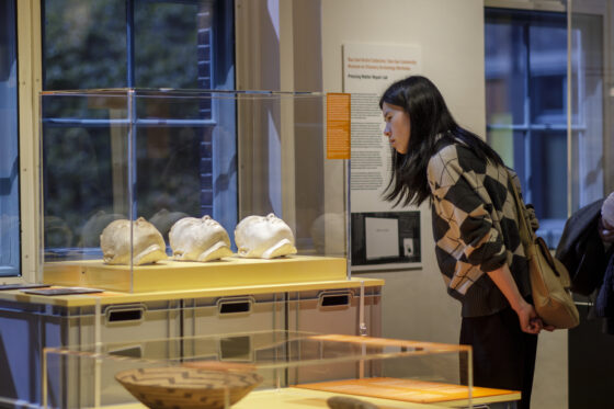Three human skulls lie in a row on a disk of black cloth – not the bones themselves, but small wooden tokens representing an uncomfortable part of the World Museum’s collection of human remains.