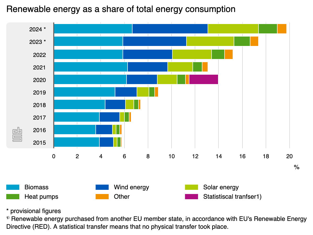 The share of renewable energy in the Netherlands rose to 19.8% of total energy consumption in 2024, up from 17.4% the year before, according to provisional figures from national statistics agency CBS.