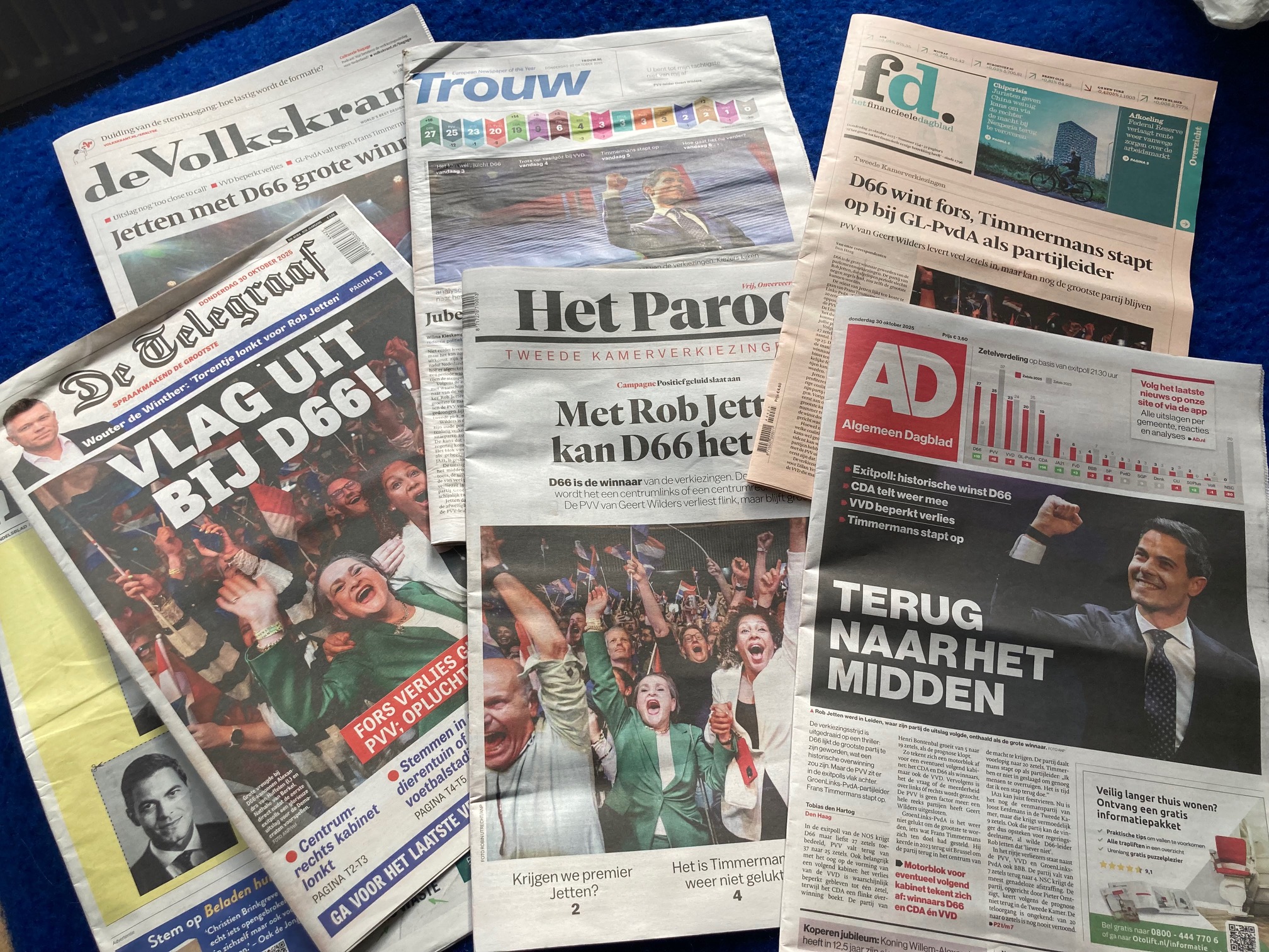 As vote counting continues in the Dutch general election, the PVV may yet come out on top, but the massive win by D66 dominates the headlines the morning after.