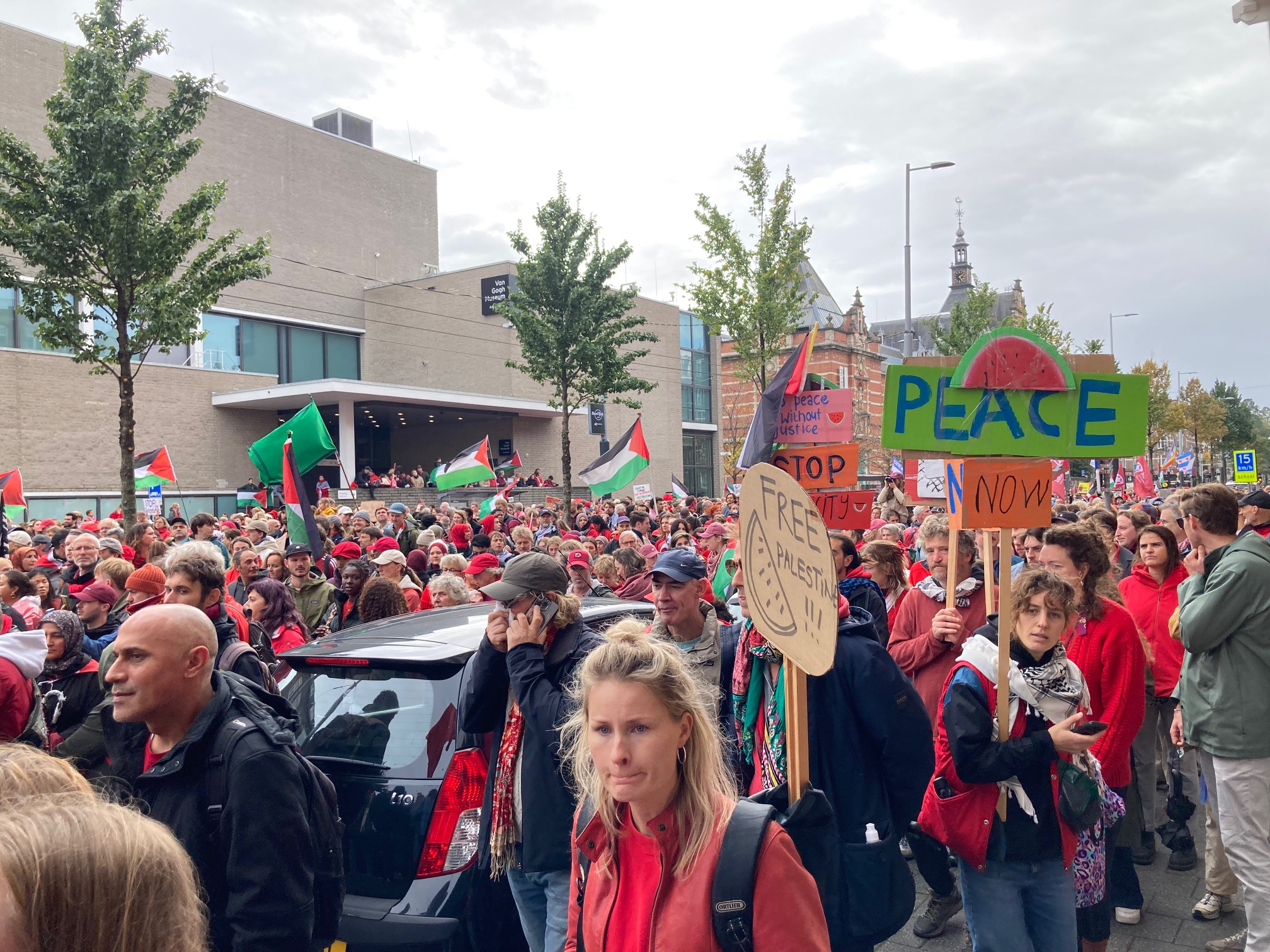 More than an two hours after the march began, demonstrators, many carrying Palestinian flags and placards, were waiting to leave the Museumplein and move off along the roads on the edge of the Vondelpark.