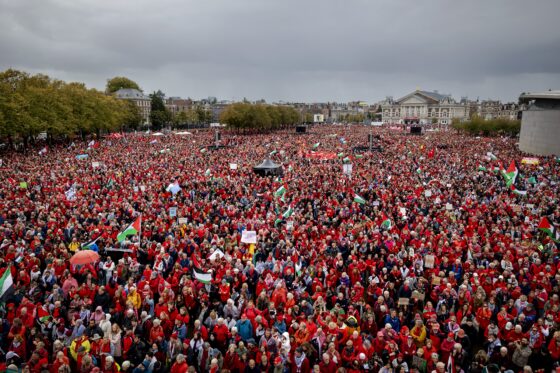 Demonstrators, many wearing something red to illustrate the “red line” they say the Dutch government has crossed by its lack of action, packed into the Museumplein and its surrounding streets.