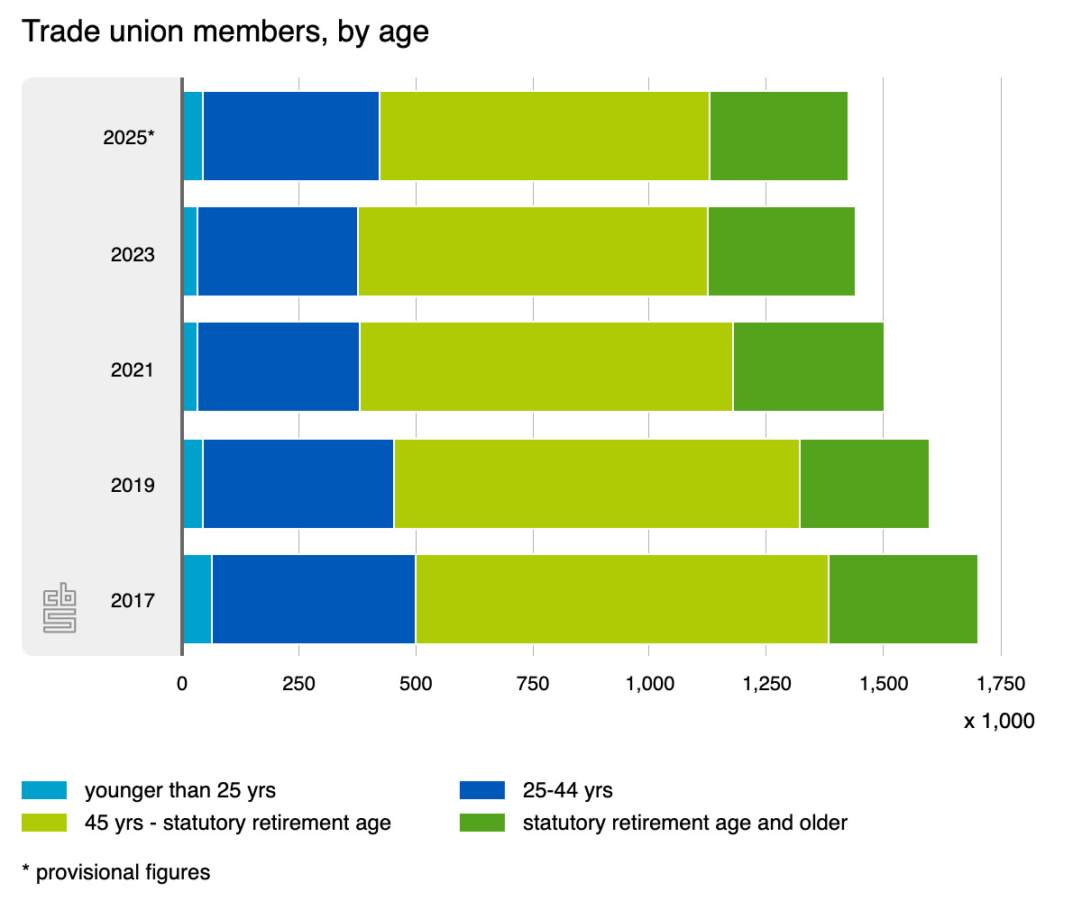 Half of all union members are aged between 45 and the state pension age of 67, but this group has shrunk the fastest since 2023. Membership among those already past retirement age also declined slightly.