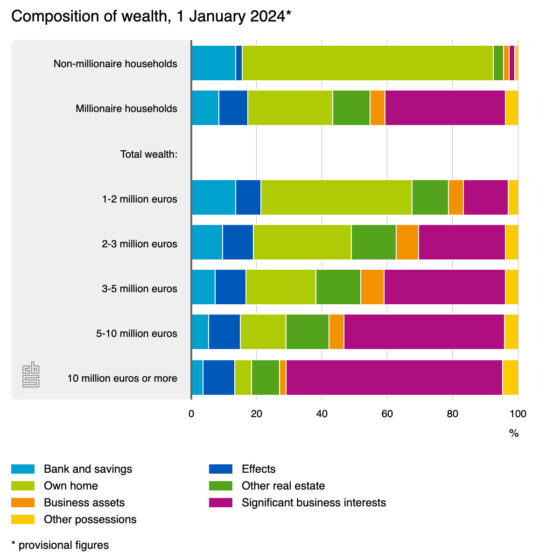 For the wealthiest households, significant business interests and company assets play a key role, accounting for nearly 40% of total wealth. Among the richest millionaires – those with assets over €10 million – two-thirds of their wealth comes from business ownership.
