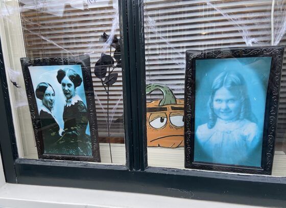 Every October, we fill our front windows with Halloween decorations. We put up holographic paintings similar to the ones at Phantom Manor at Disneyland Paris, a life-sized raven, a cheeky Beetlejuice poster, and lots of fake cobwebs.