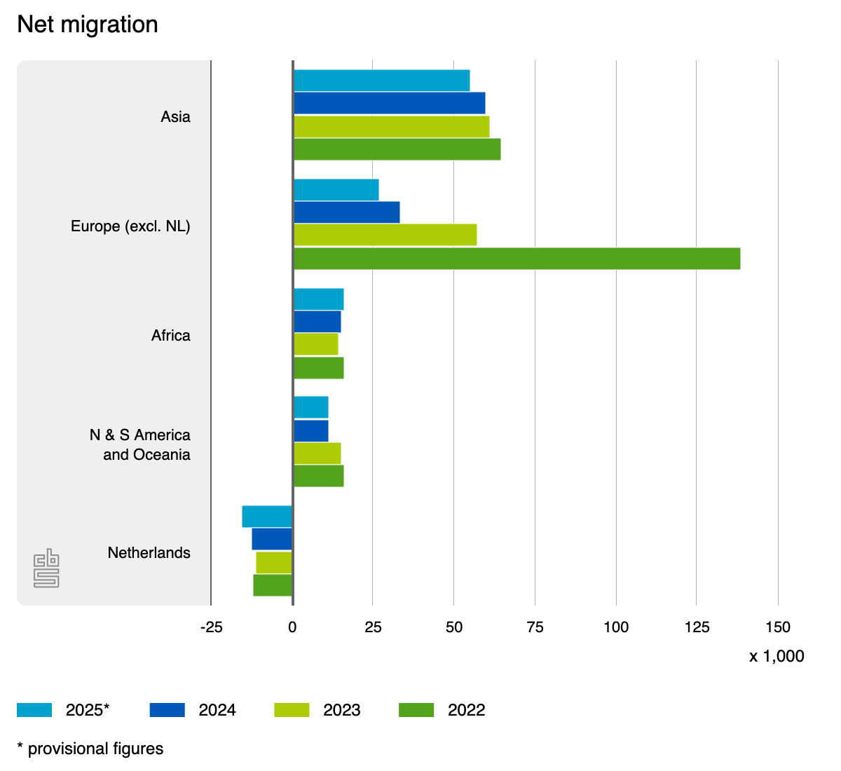 The population of the Netherlands increased by 87,000 in 2025 to 18.13 million and the rise was due entirely to migration as death rates continue to outstrip live births, national statistics agency CBS said on Monday.